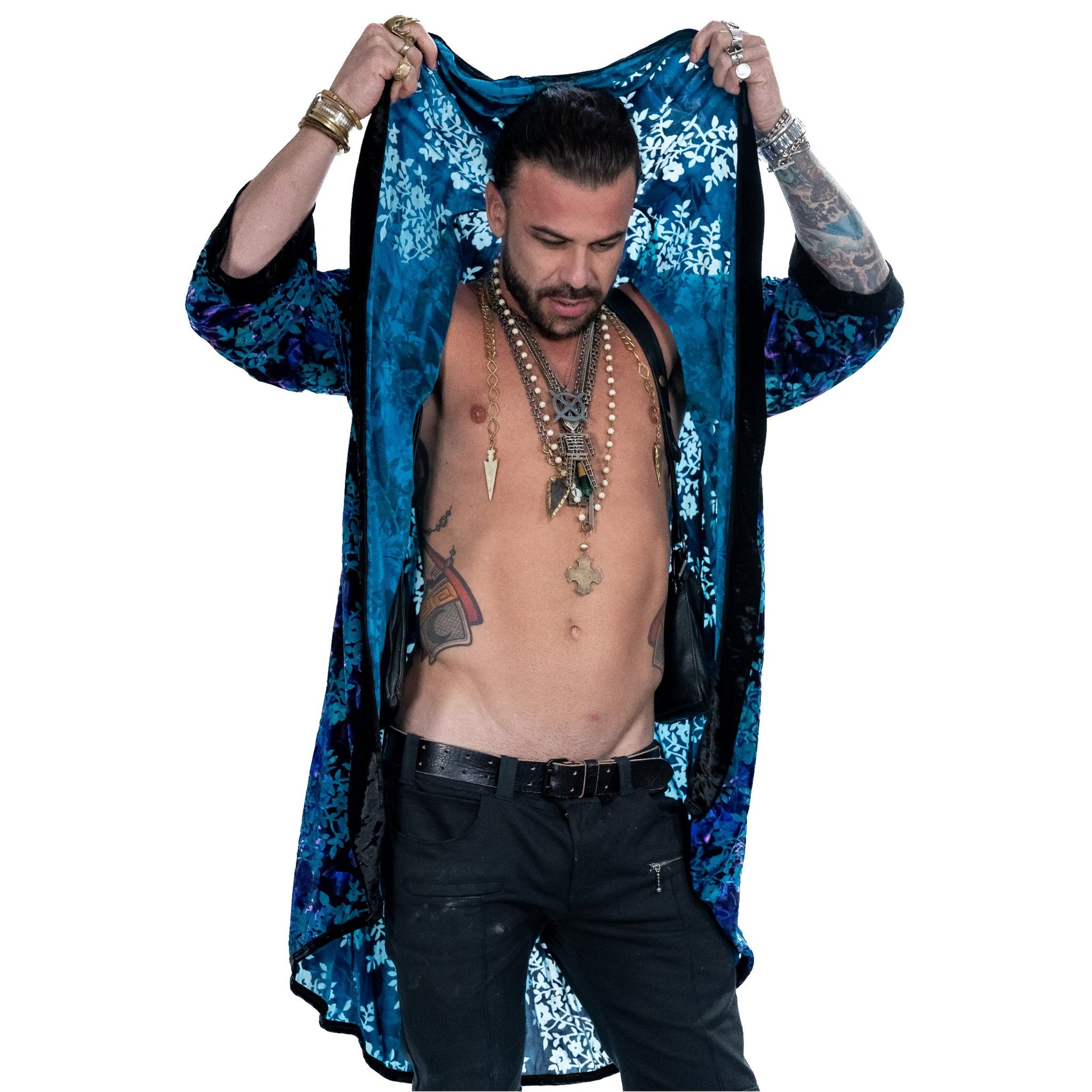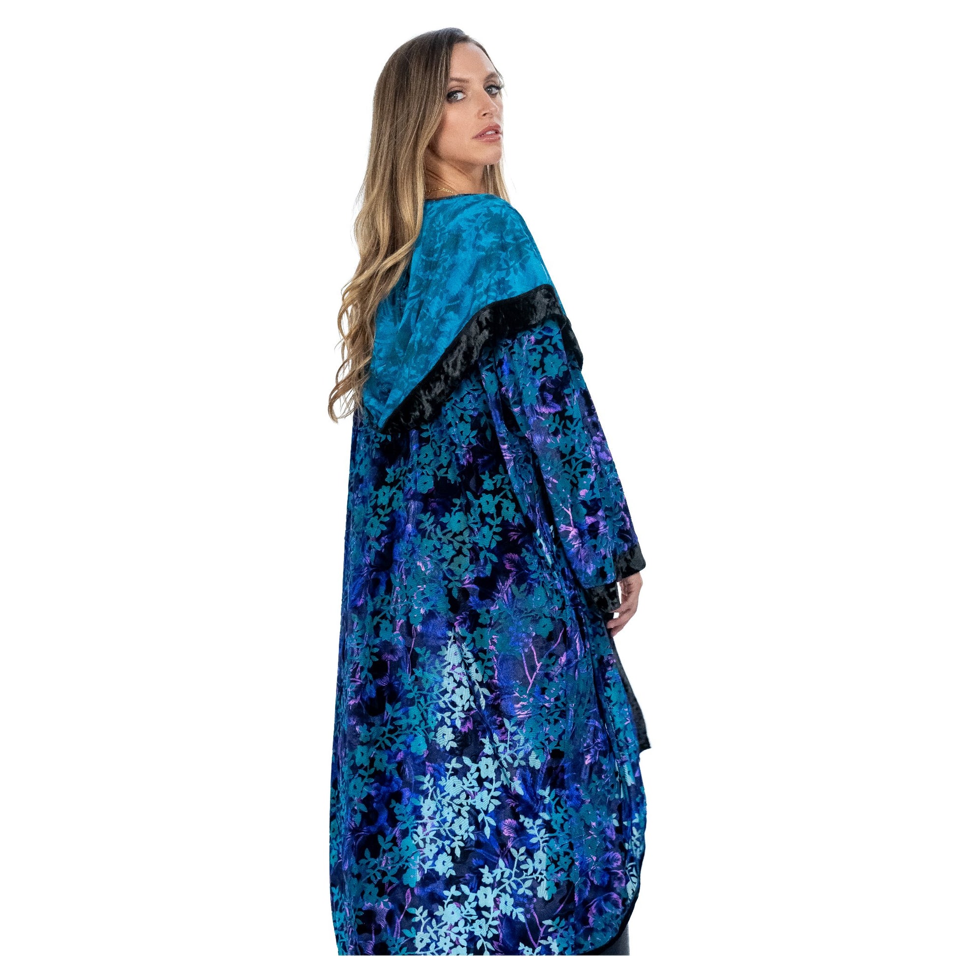 This kimono embodies a harmonious blend of lightweight, breathable, and durable features, cocooned in an irresistibly soft texture. Crafted from a 4-way stretch burnout velvet fabric, it ensures superior breathability, complemented by intricate patterned details. Designed to accommodate all sizes, this artisan-crafted piece is meticulously created in Los Angeles, California, and includes straightforward care instructions: cold wash and hang dry.