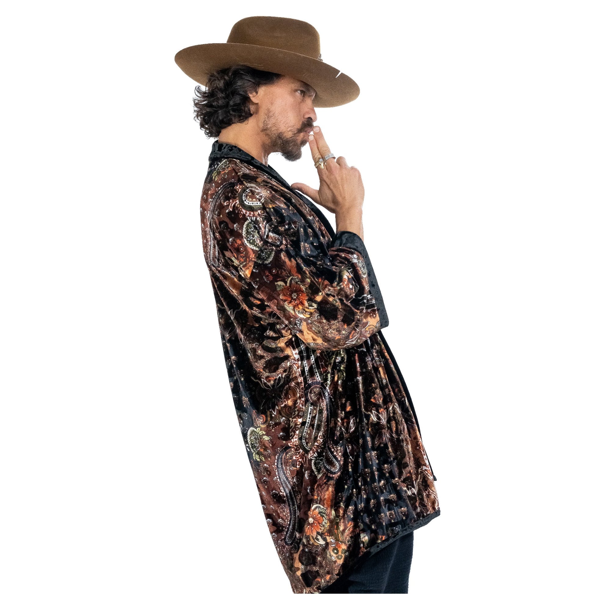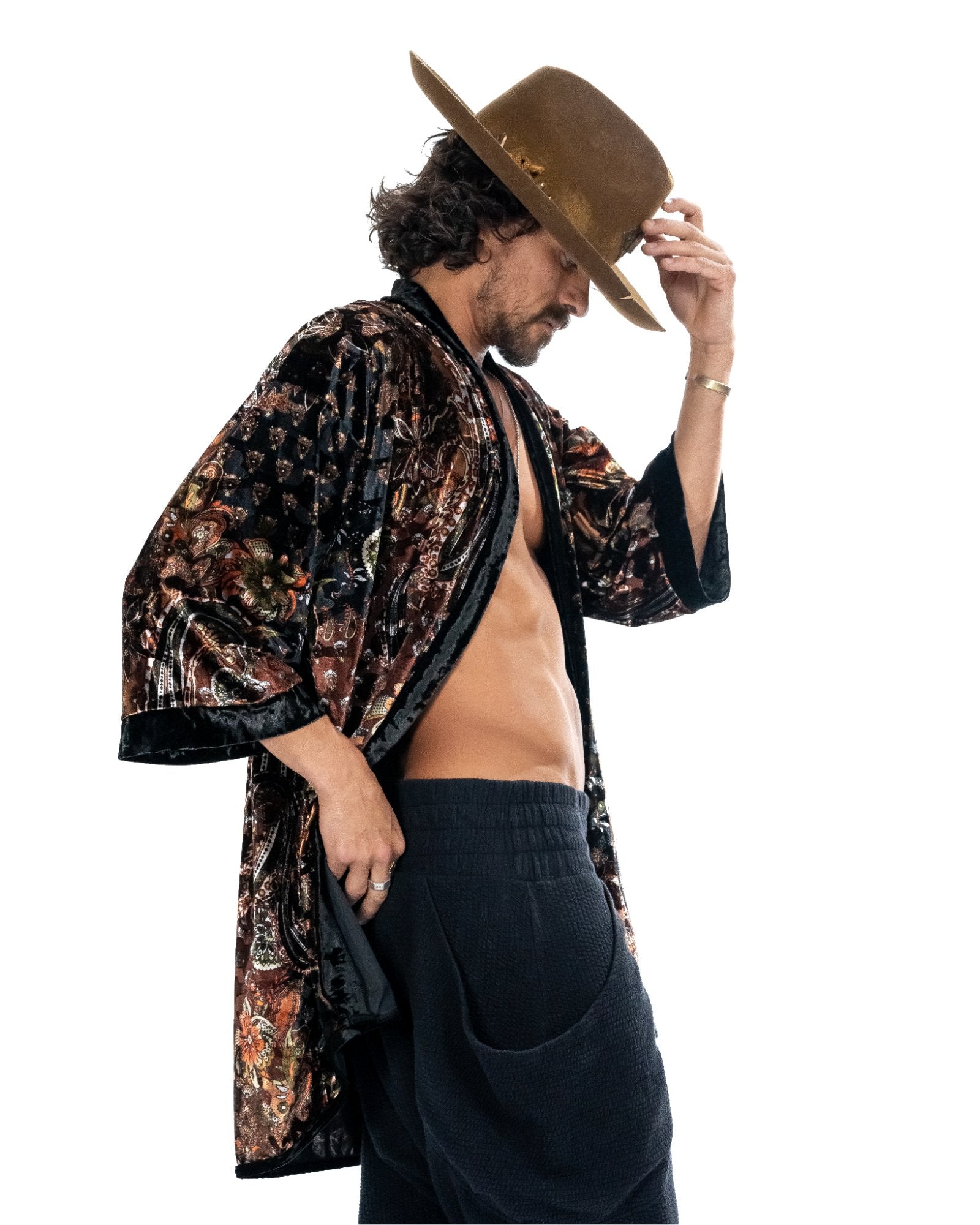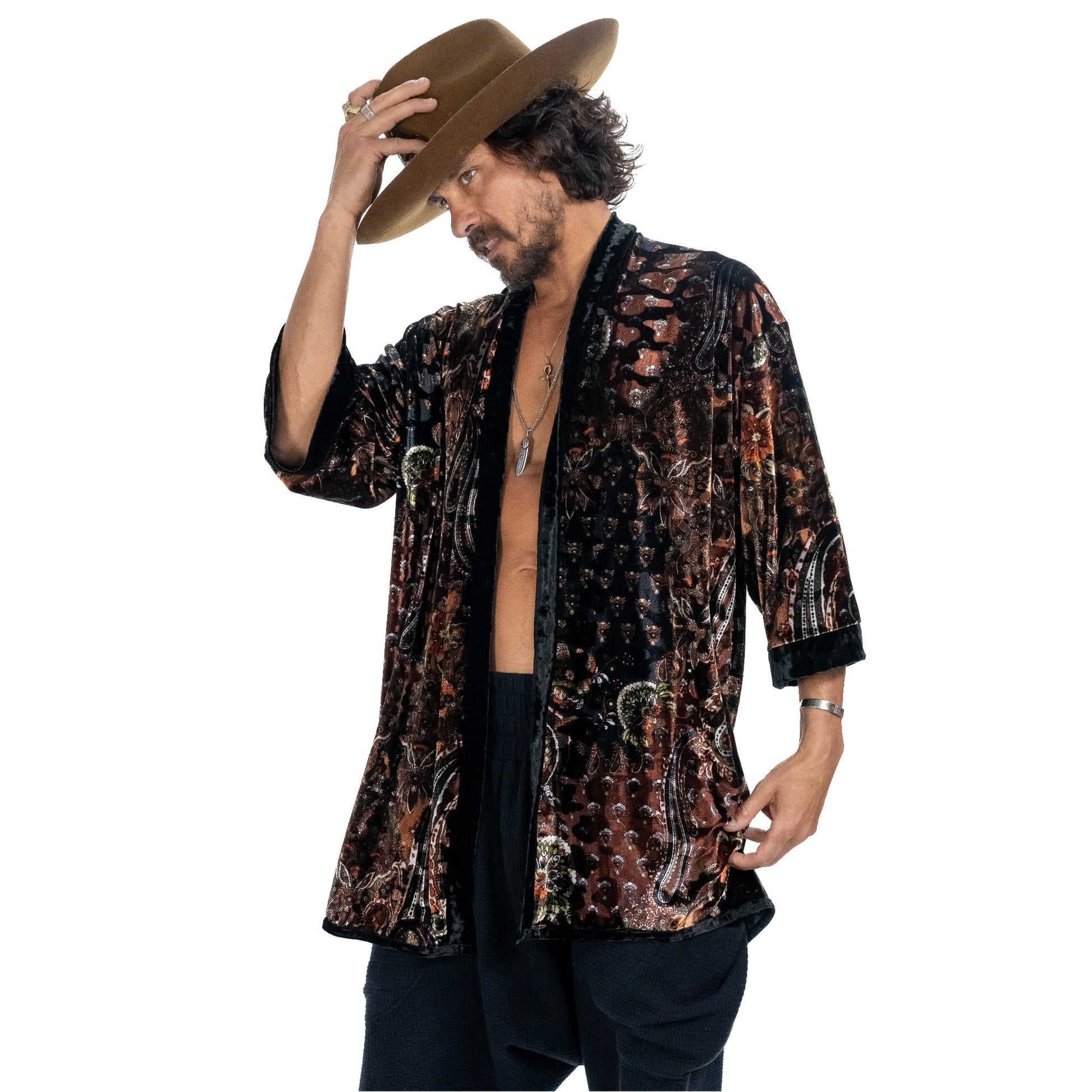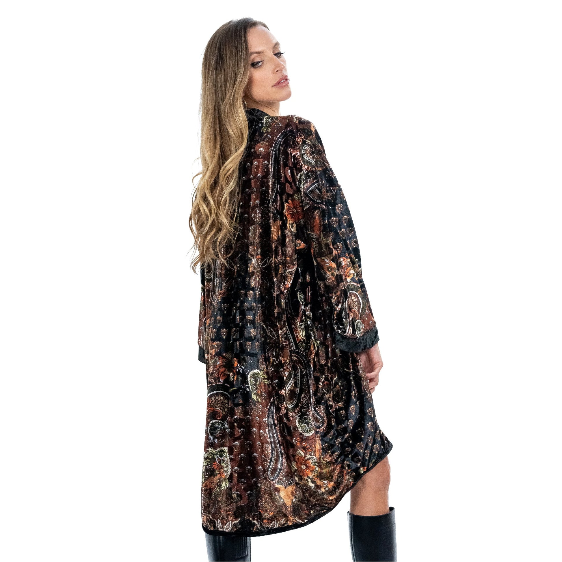 This kimono epitomizes a seamless fusion of durability and luxurious softness in an irresistibly plush texture. Fashioned from a 4-way stretch crushed velvet fabric, it guarantees exceptional breathability, enhanced by intricate patterned details. Designed to fit all sizes, this artisan-crafted piece is meticulously handmade in Los Angeles, California, and comes with simple care instructions: cold wash and hang dry.